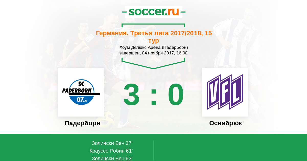 Германия. Третья лига 17.12.2016 Падерборн Логотип футбольный клуб Падерборн 3:1 Логотип футбольный клуб Оснабрюк Оснабрюк