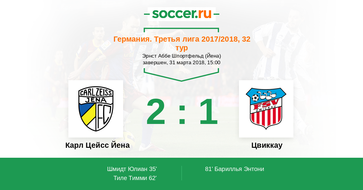 Германия. Третья лига 22.10.2017 Цвиккау Логотип футбольный клуб Цвиккау 2:1 Логотип футбольный клуб Карл Цейсс Йена Карл Цейсс Йена
