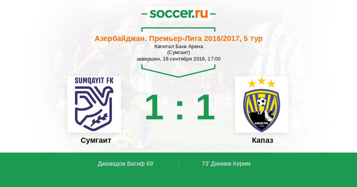 Азербайджан. Премьер-Лига 13.08.2017 Сумгаит Логотип футбольный клуб Сумгаит 2:1 Логотип футбольный клуб Капаз (Гянджа) Капаз