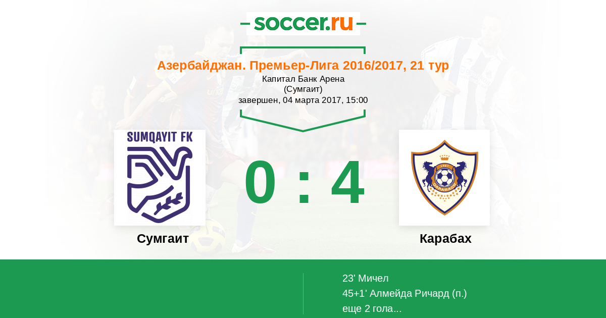 Азербайджан. Премьер-Лига 23.04.2017 Карабах Логотип футбольный клуб Карабах (Агдам) 2:1 Логотип футбольный клуб Сумгаит Сумгаит