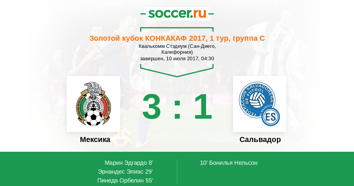 Золотой кубок КОНКАКАФ 19.07.2021 Мексика Логотип Мексика 1:0 Логотип Сальвадор Сальвадор