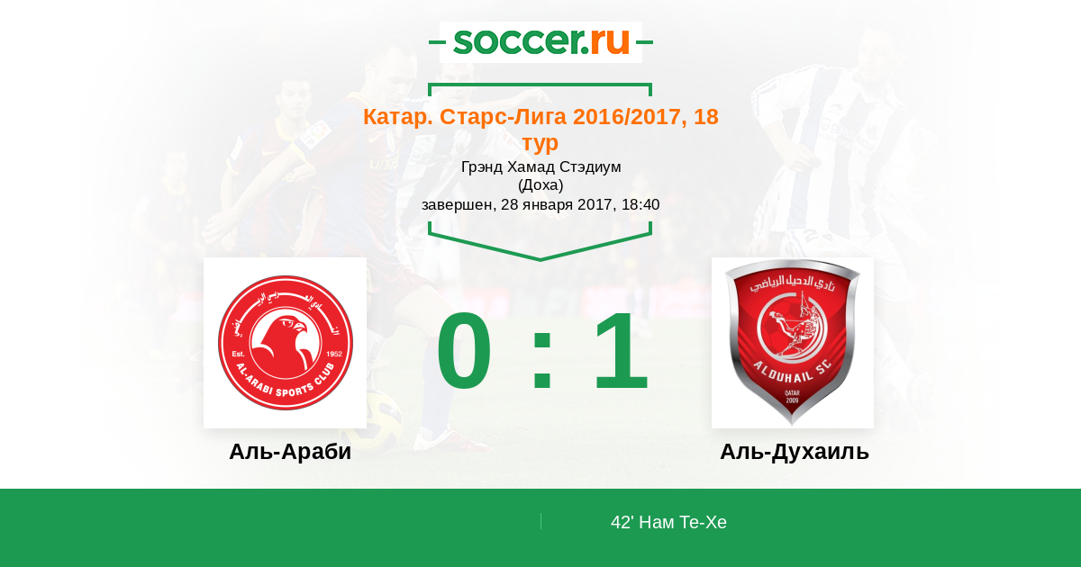 Катар. Старс Лига 19.01.2018 Аль-Араби Логотип футбольный клуб Аль-Араби (Доха) 0:1 Логотип футбольный клуб Аль-Духаиль (Доха) Аль-Духаиль