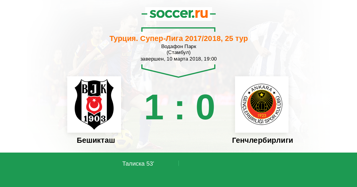 Турция. Суперлига 02.04.2017 Бешикташ Логотип футбольный клуб Бешикташ (Стамбул) 3:0 Логотип футбольный клуб Генчлербирлиги (Анкара) Генчлербирлиги