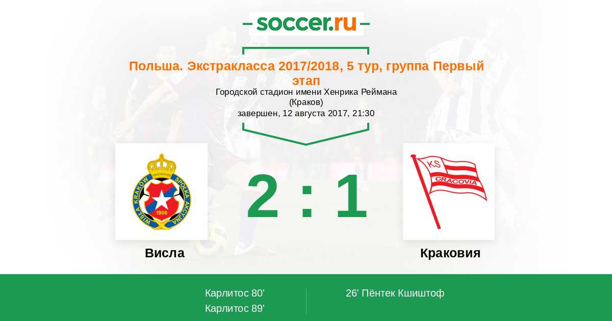Польша. Экстракласса 05.08.2016 Краковия Логотип футбольный клуб Краковия 2:1 Логотип футбольный клуб Висла (Краков) Висла
