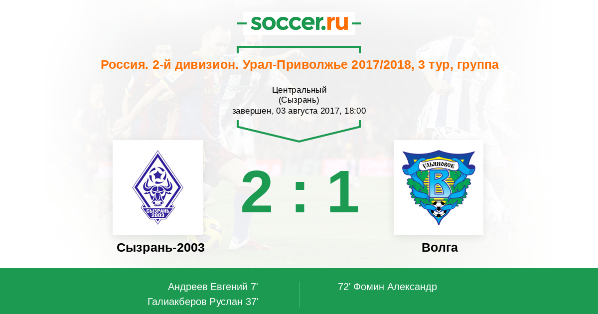 Россия. Вторая лига. Группа 4 18.04.2017 Волга Логотип футбольный клуб Волга (Ульяновск) 1:0 Логотип футбольный клуб Сызрань-2003 Сызрань-2003