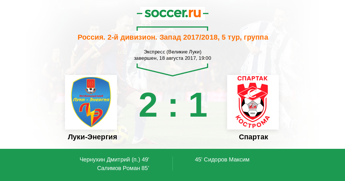 Россия. Вторая лига. Группа 2 02.04.2023 Луки-Энергия Логотип футбольный клуб Луки-Энергия (Великие Луки) 1:3 Логотип футбольный клуб Спартак Кострома Спартак Кострома
