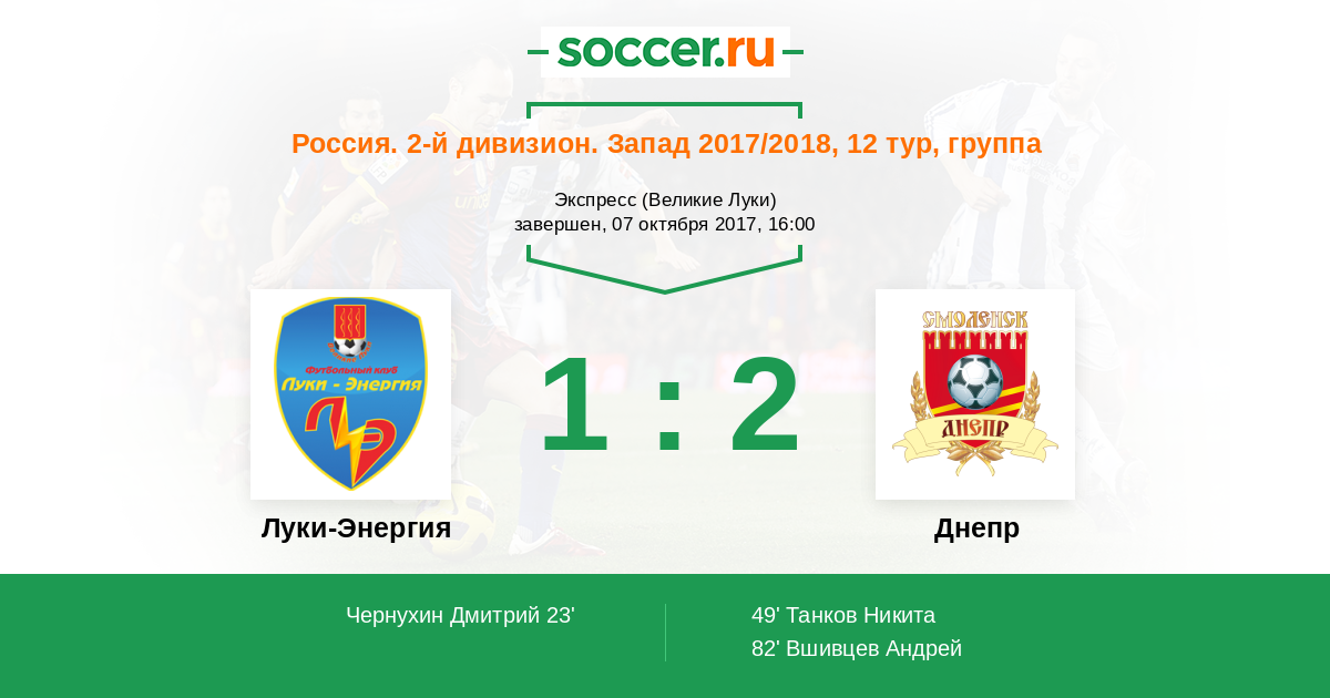 Россия. Вторая лига. Группа 2 25.08.2018 Днепр Логотип футбольный клуб Днепр (Смоленск) 1:0 Логотип футбольный клуб Луки-Энергия (Великие Луки) Луки-Энергия