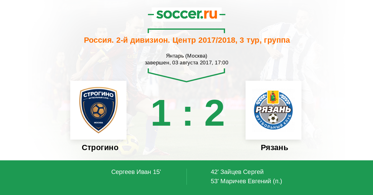 Россия. Вторая лига. Группа 3 17.08.2018 Рязань Логотип футбольный клуб Рязань 2:0 Логотип футбольный клуб Строгино (Москва) Строгино