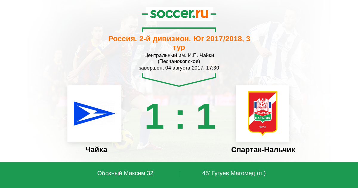 Россия. Вторая лига. Группа 1 12.09.2021 Спартак-Нальчик Логотип футбольный клуб Спартак-Нальчик 1:0 Логотип футбольный клуб Чайка (Песчанокопское) Чайка