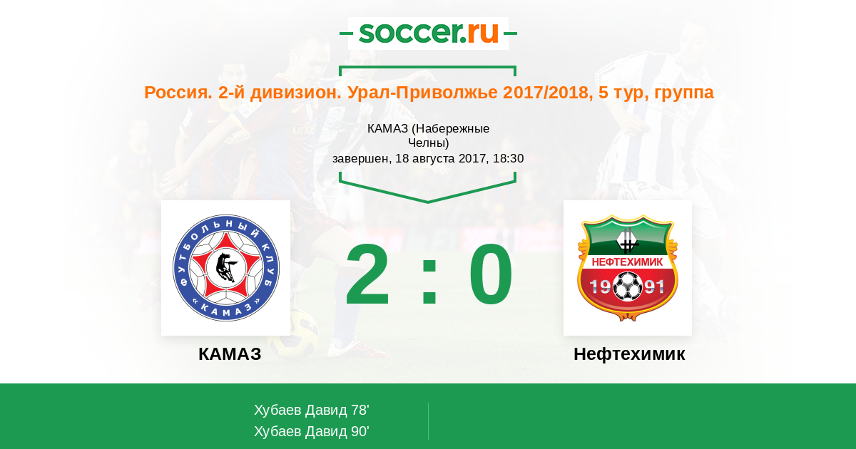 Россия. Вторая лига. Группа 4 30.09.2018 КАМАЗ Логотип футбольный клуб КАМАЗ (Набережные Челны) 1:2 Логотип футбольный клуб Нефтехимик (Нижнекамск) Нефтехимик