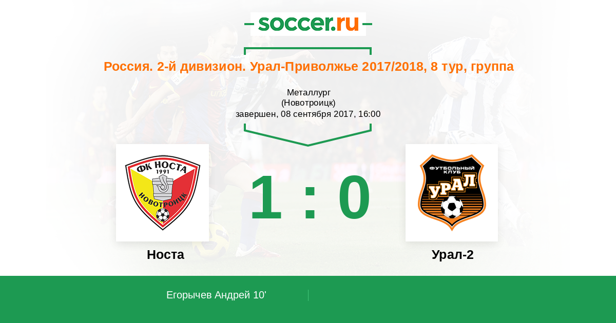 Россия. Вторая лига. Группа 4 23.09.2018 Носта Логотип футбольный клуб Носта (Новотроицк) 4:1 Логотип футбольный клуб Урал-2 (Екатеринбург) Урал-2