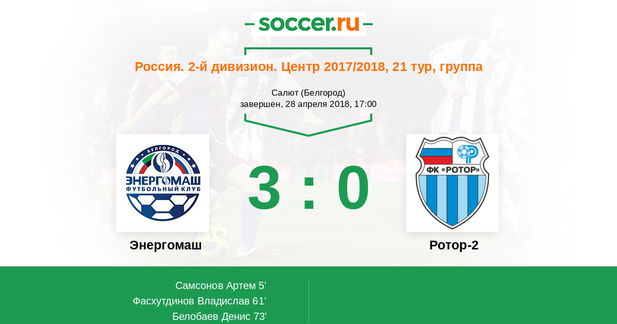 Россия. Вторая лига. Группа 3 28.04.2018 Энергомаш Логотип футбольный клуб Энергомаш (Белгород) 3:0 Логотип футбольный клуб Ротор-2 (Волгоград) Ротор-2
