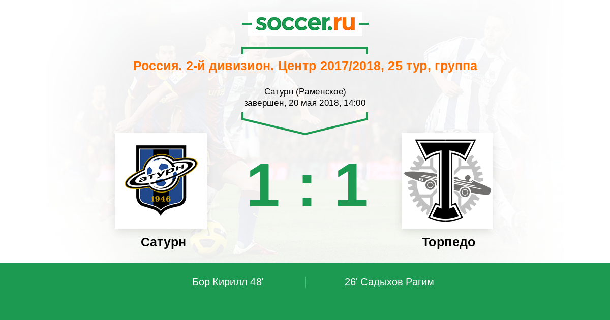 Россия. Вторая лига. Группа 3 07.05.2017 Сатурн Логотип футбольный клуб Сатурн (Раменское) 1:1 Логотип футбольный клуб Торпедо (Москва) Торпедо