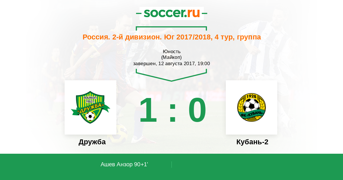 Россия. Вторая лига. Группа 1 23.10.2016 Дружба Логотип футбольный клуб Дружба (Майкоп) 0:0 Логотип футбольный клуб Кубань-2 (Краснодар) Кубань-2