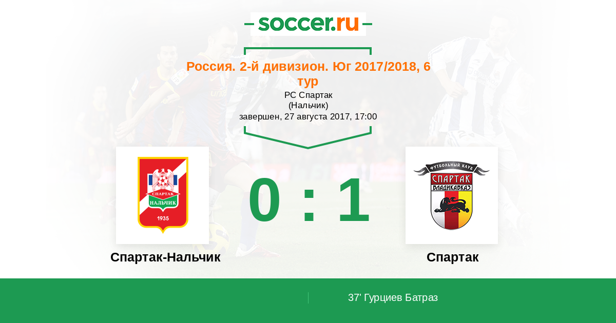 Россия. Вторая лига. Группа 1 25.07.2018 Спартак Логотип футбольный клуб Спартак (Владикавказ) 1:2 Логотип футбольный клуб Спартак-Нальчик Спартак-Нальчик