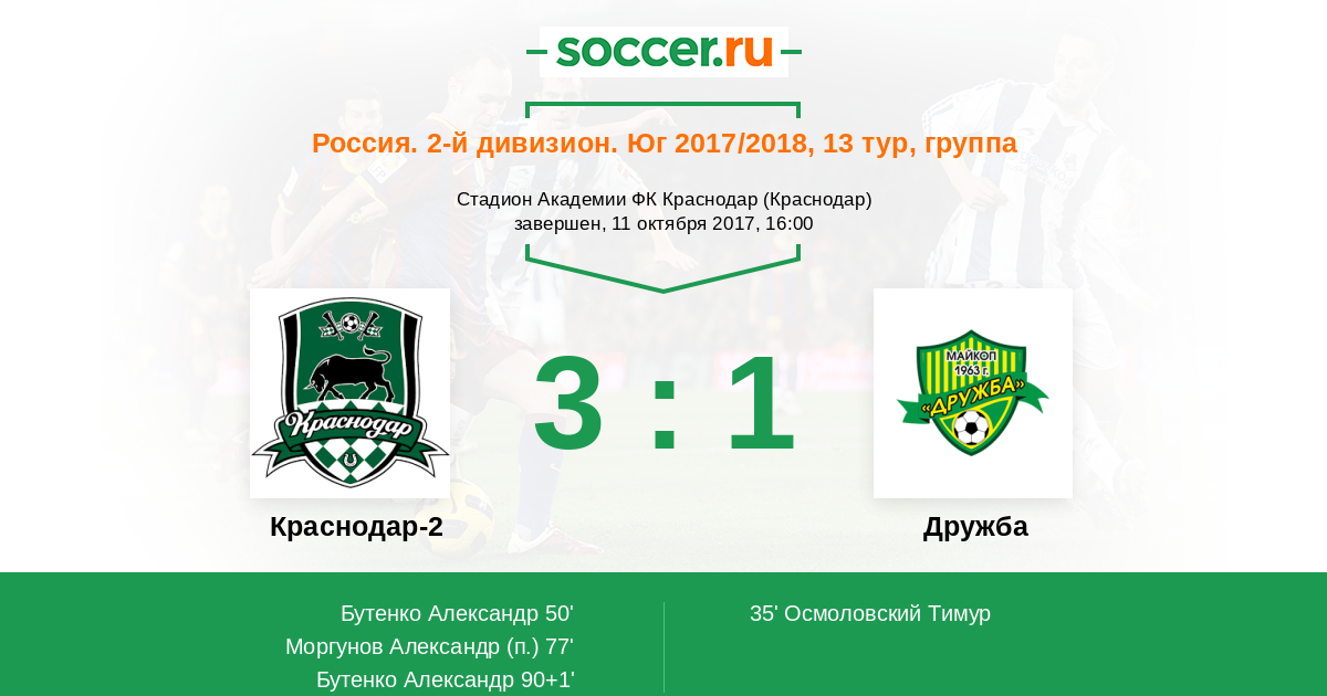 Россия. Вторая лига. Группа 1 28.04.2018 Дружба Логотип футбольный клуб Дружба (Майкоп) 3:1 Логотип футбольный клуб Краснодар-2 Краснодар-2