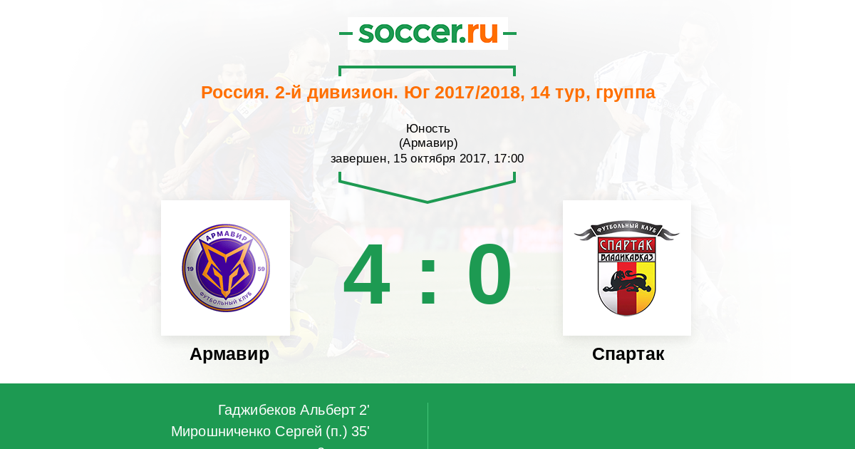 Россия. Вторая лига. Группа 1 23.04.2017 Армавир Логотип футбольный клуб Армавир 1:0 Логотип футбольный клуб Спартак (Владикавказ) Спартак