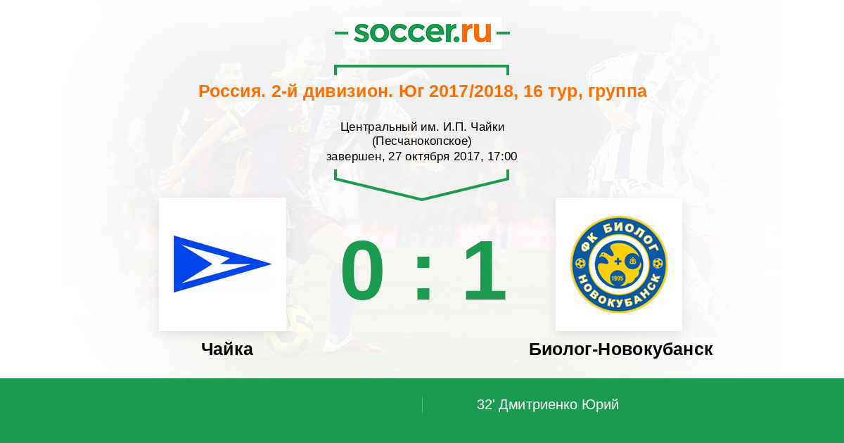Россия. Вторая лига. Группа 1 04.06.2017 Чайка Логотип футбольный клуб Чайка (Песчанокопское) 5:1 Логотип футбольный клуб Биолог-Новокубанск Биолог-Новокубанск