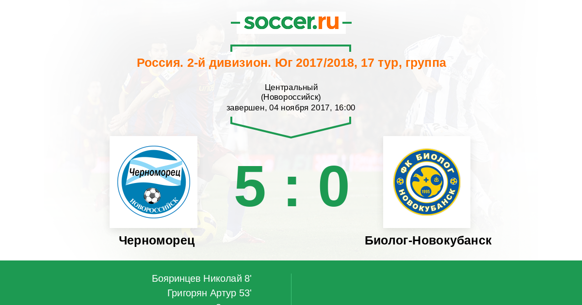 Россия. Вторая лига. Группа 1 09.04.2017 Биолог-Новокубанск Логотип футбольный клуб Биолог-Новокубанск 0:2 Логотип футбольный клуб Черноморец (Новороссийск) Черноморец