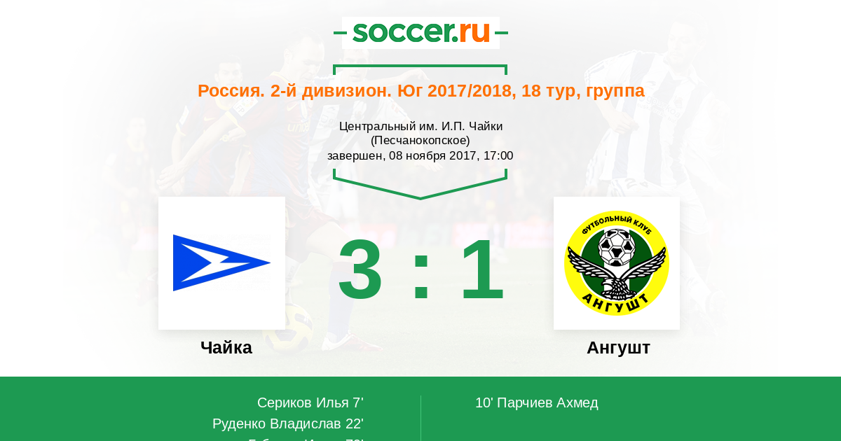 Россия. Вторая лига. Группа 1 28.07.2017 Ангушт Логотип футбольный клуб Ангушт (Назрань) 1:0 Логотип футбольный клуб Чайка (Песчанокопское) Чайка