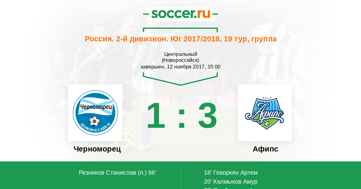 Россия. Вторая лига. Группа 1 06.11.2014 Черноморец Логотип футбольный клуб Черноморец (Новороссийск) 2:0 Логотип футбольный клуб Афипс (Афипский) Афипс