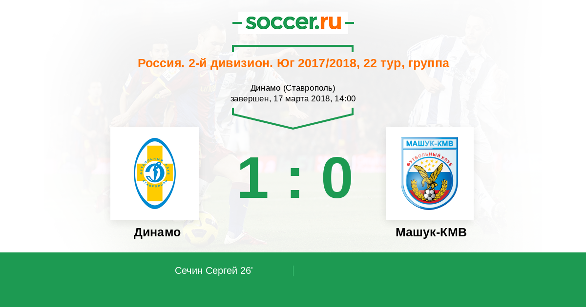 Россия. Вторая лига. Группа 1 26.08.2017 Машук-КМВ Логотип футбольный клуб Машук-КМВ (Пятигорск) 4:2 Логотип футбольный клуб Динамо Ставрополь Динамо Ставрополь