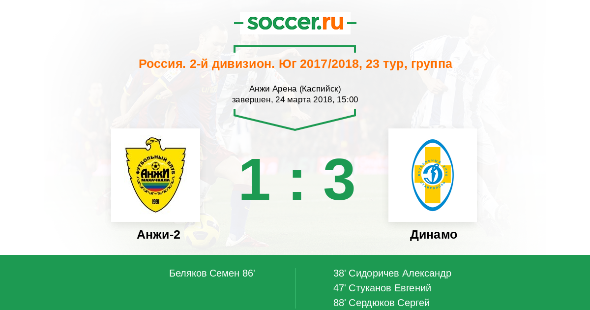 Россия. Вторая лига. Группа 1 04.04.2018 Анжи-2 Логотип футбольный клуб Анжи-2 (Махачкала) 0:1 Логотип футбольный клуб Биолог-Новокубанск Биолог-Новокубанск