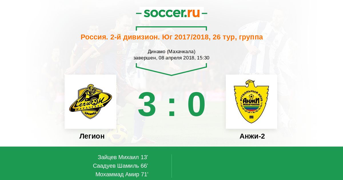Россия. Вторая лига. Группа 1 08.04.2018 Легион Логотип футбольный клуб Легион (Махачкала) 3:0 Логотип футбольный клуб Анжи-2 (Махачкала) Анжи-2