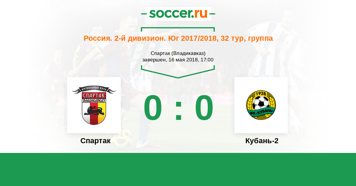 Россия. Вторая лига. Группа 1 04.06.2017 Кубань-2 Логотип футбольный клуб Кубань-2 (Краснодар) 0:2 Логотип футбольный клуб Спартак (Владикавказ) Спартак