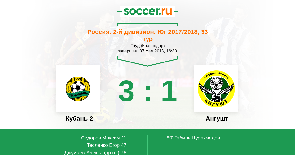 Россия. Вторая лига. Группа 1 07.05.2018 Кубань-2 Логотип футбольный клуб Кубань-2 (Краснодар) 3:1 Логотип футбольный клуб Ангушт (Назрань) Ангушт