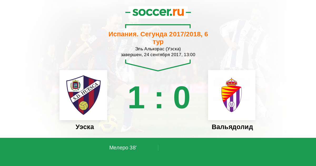 Испания. Сегунда 24.09.2016 Вальядолид Логотип футбольный клуб Вальядолид 1:2 Логотип футбольный клуб Уэска Уэска
