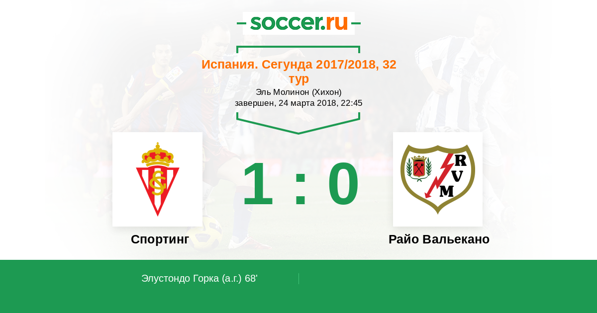 Испания. Примера 21.04.2012 Спортинг Логотип футбольный клуб Спортинг (Хихон) 2:1 Логотип футбольный клуб Райо Вальекано (Мадрид) Райо Вальекано