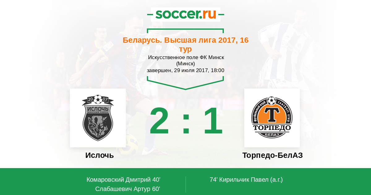 Беларусь. Высшая лига 01.04.2017 Торпедо-БелАЗ Логотип футбольный клуб Торпедо-БелАЗ (Жодино) 2:1 Логотип футбольный клуб Ислочь (Минск) Ислочь
