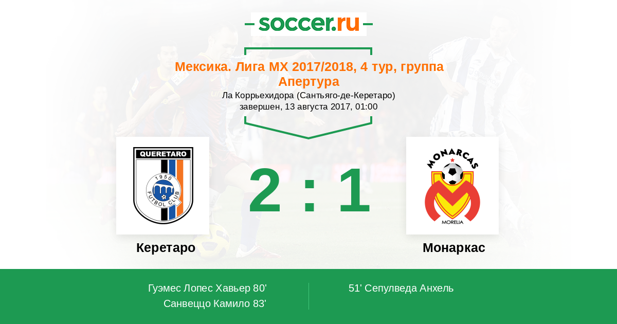 Мексика. Примера-Дивизион 20.07.2013 Керетаро Логотип футбольный клуб Керетаро (Сантьяго-де-Керетаро) 1:3 Логотип футбольный клуб Монаркас (Морелия) Монаркас
