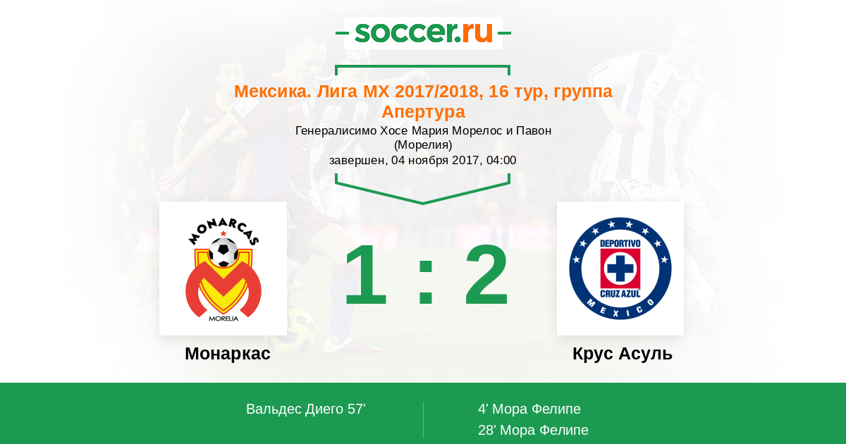 Мексика. Примера-Дивизион 08.04.2017 Крус Асуль Логотип футбольный клуб Крус Асуль (Мехико) 1:1 Логотип футбольный клуб Монаркас (Морелия) Монаркас