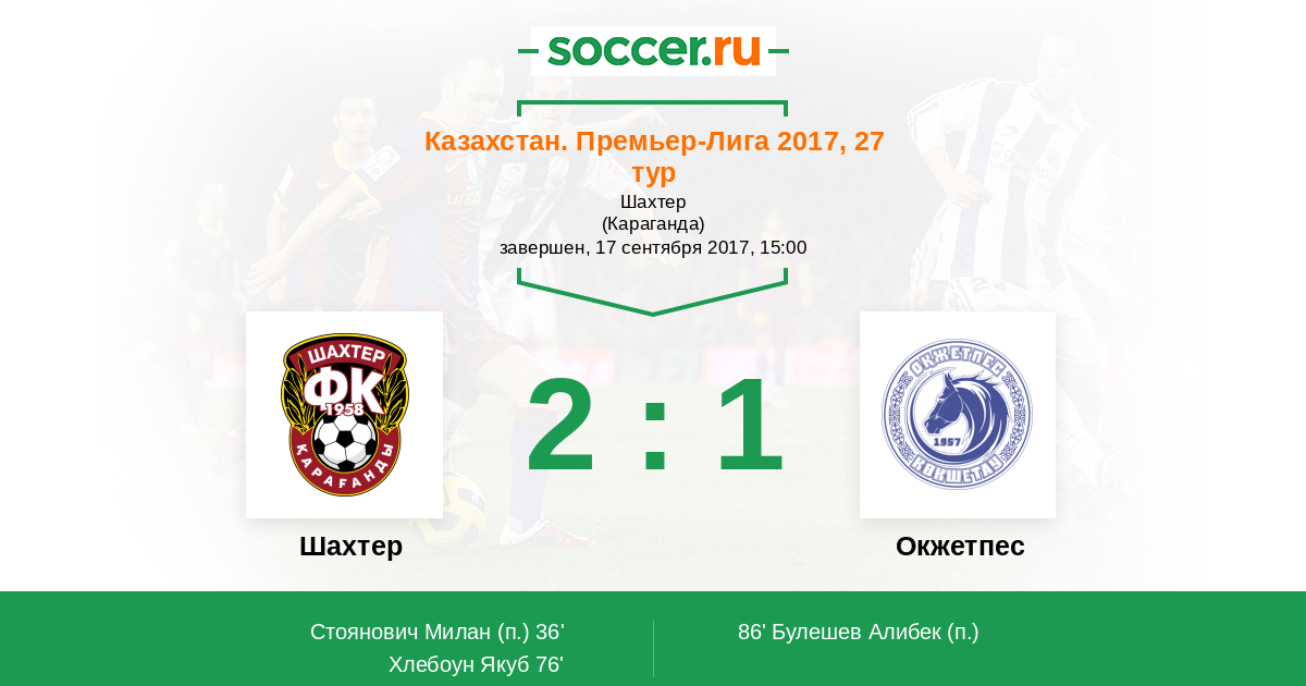 Казахстан. Премьер-лига 15.07.2017 Шахтер Логотип футбольный клуб Шахтер (Караганда) 1:0 Логотип футбольный клуб Окжетпес (Кокшетау) Окжетпес