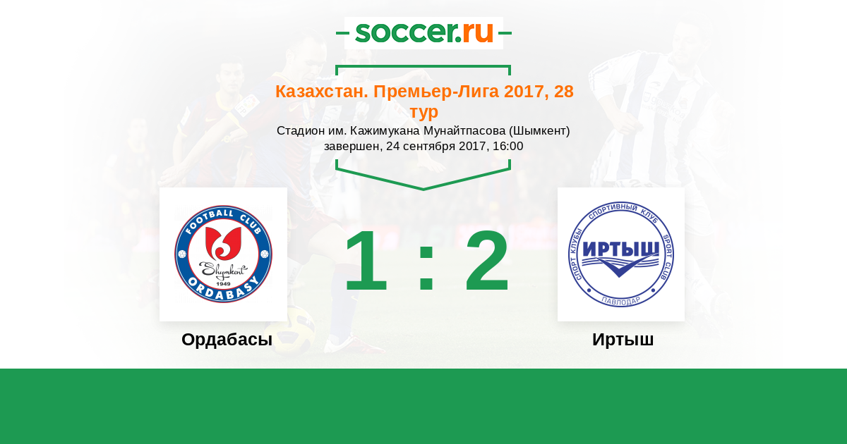 Казахстан. Премьер-лига 11.09.2016 Иртыш Логотип футбольный клуб Иртыш (Павлодар) 1:2 Логотип футбольный клуб Ордабасы (Шымкент) Ордабасы
