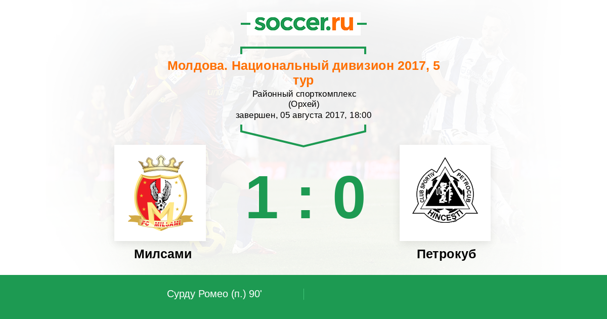 Молдова. Национальный дивизион 16.09.2016 Милсами Логотип футбольный клуб Милсами (Оргеев) 5:0 Логотип футбольный клуб Петрокуб (Хынчешты) Петрокуб