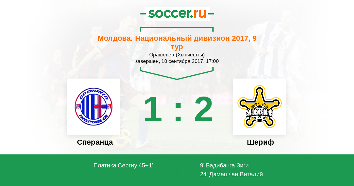 Молдова. Национальный дивизион 25.09.2016 Шериф Логотип футбольный клуб Шериф (Тирасполь) 2:0 Логотип футбольный клуб Сперанца (Крихана Веке) Сперанца