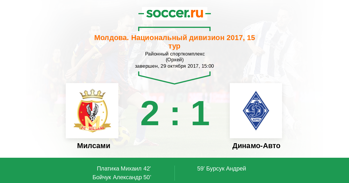 Молдова. Национальный дивизион 19.09.2015 Динамо-Авто Логотип футбольный клуб Динамо-Авто (Тирасполь) 1:2 Логотип футбольный клуб Милсами (Оргеев) Милсами