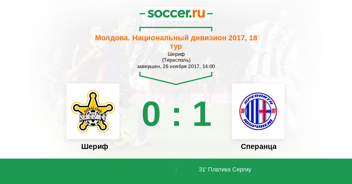 Молдова. Национальный дивизион 25.09.2016 Шериф Логотип футбольный клуб Шериф (Тирасполь) 2:0 Логотип футбольный клуб Сперанца (Крихана Веке) Сперанца