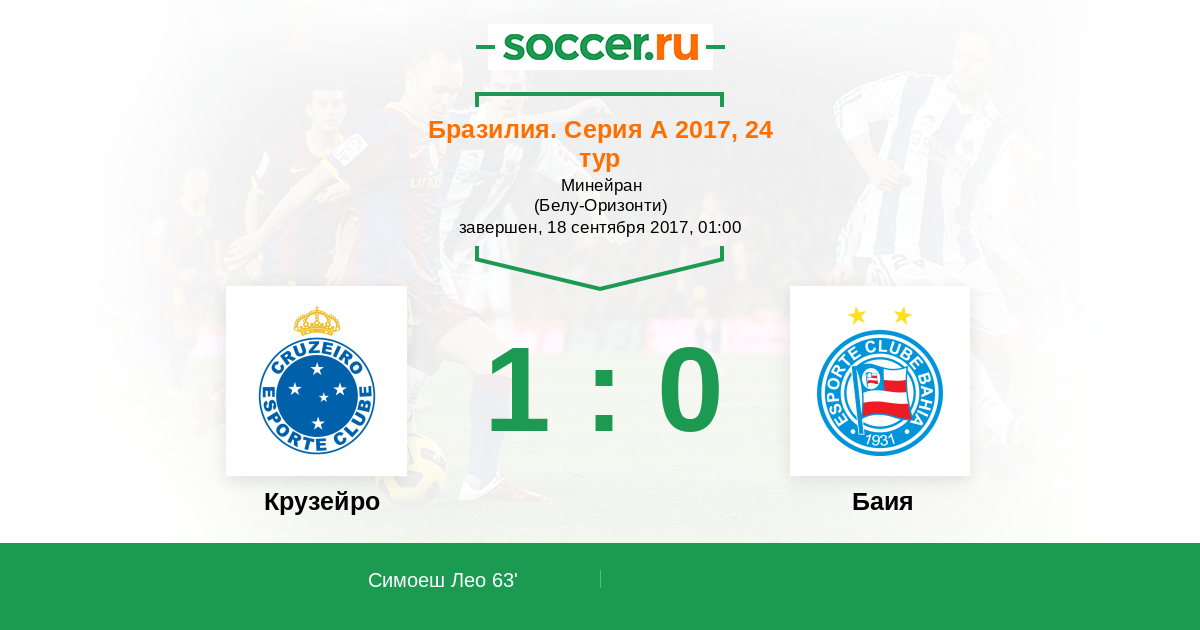 Бразилия. Серия А 09.06.2017 Баия Логотип футбольный клуб Баия (Салвадор) 1:0 Логотип футбольный клуб Крузейро (Белу-Оризонти) Крузейро