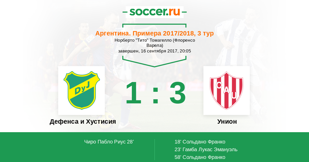 Аргентина. Суперлига 17.04.2017 Унион Логотип футбольный клуб Унион (Санта-Фе) 0:2 Логотип футбольный клуб Дефенса и Хустисия (Флоренсио-Варела) Дефенса и Хустисия