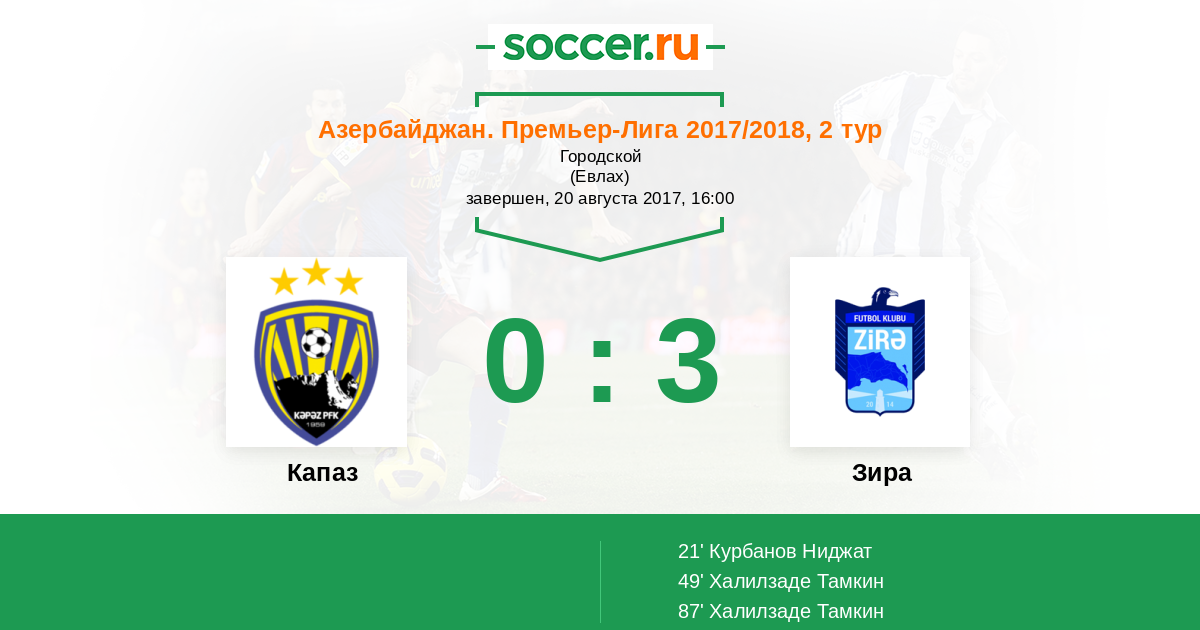 Азербайджан. Премьер-Лига 14.10.2017 Зира Логотип футбольный клуб Зира 3:0 Логотип футбольный клуб Капаз (Гянджа) Капаз