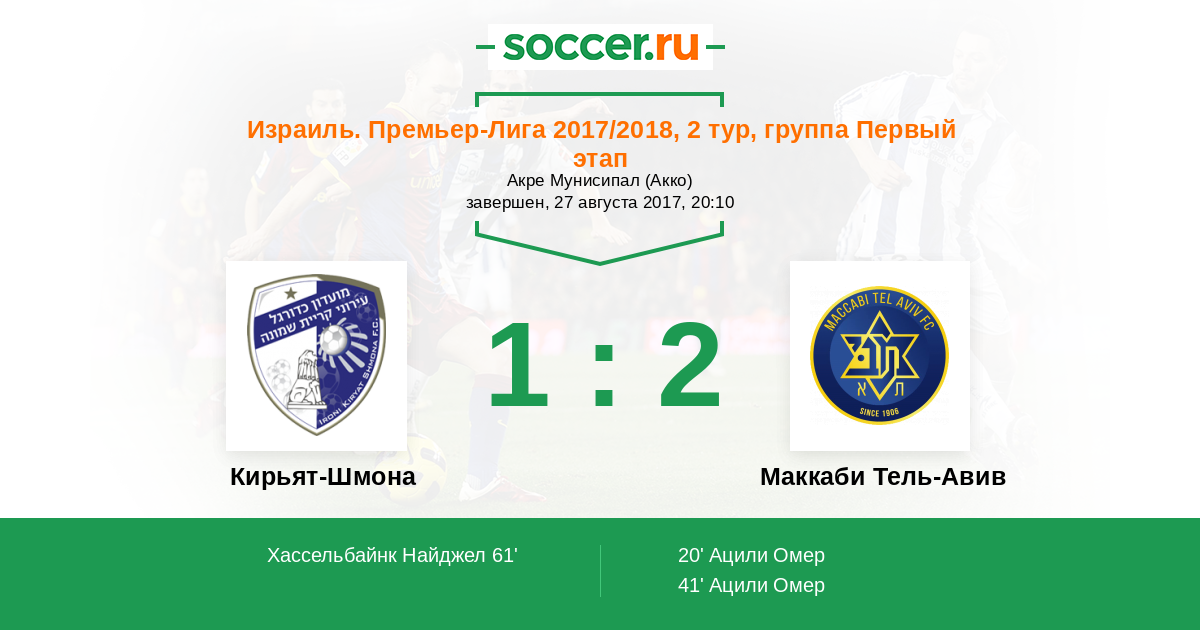 Израиль. Премьер-Лига 23.12.2017 Маккаби Тель-Авив Логотип футбольный клуб Маккаби Тель-Авив 2:1 Логотип футбольный клуб Кирьят-Шмона Кирьят-Шмона
