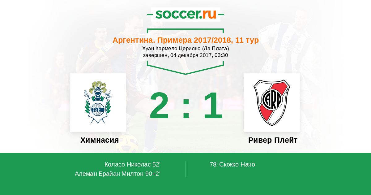 Аргентина. Суперлига 23.05.2017 Химнасия Логотип футбольный клуб Химнасия (Ла-Плата) 0:3 Логотип футбольный клуб Ривер Плейт (Буэнос-Айрес) Ривер Плейт
