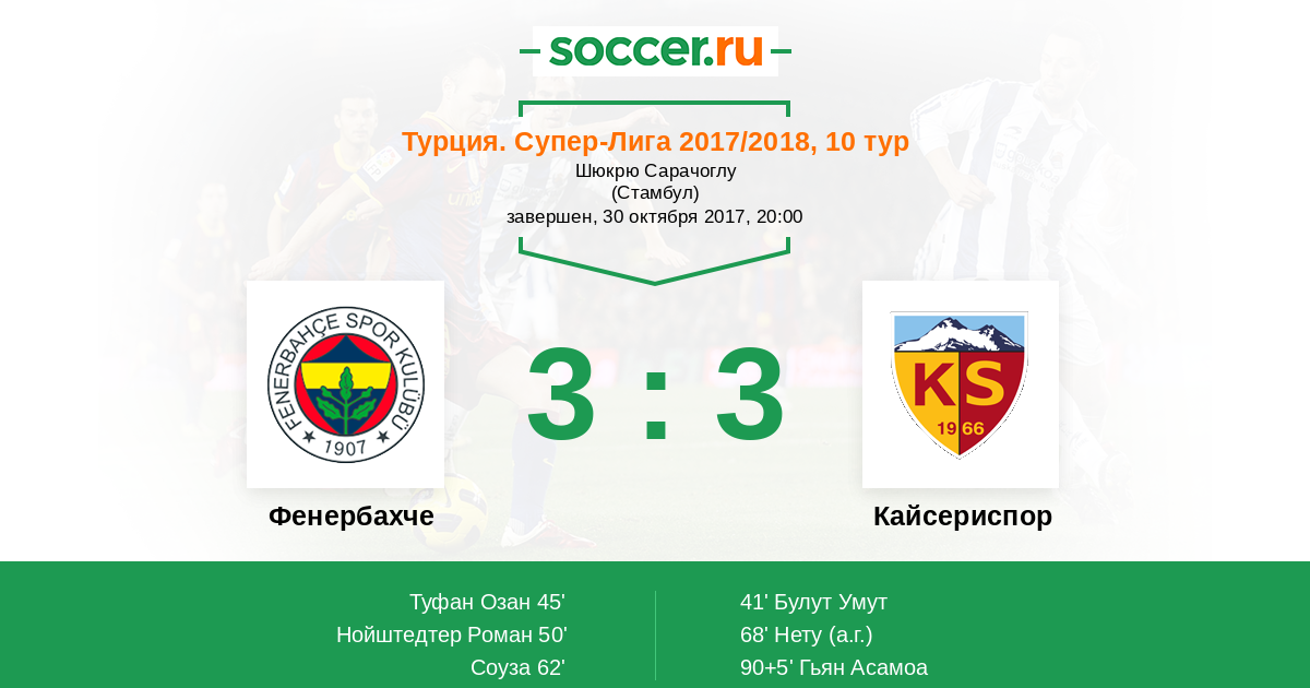 Турция. Суперлига 02.04.2018 Кайсериспор Логотип футбольный клуб Кайсериспор 0:5 Логотип футбольный клуб Фенербахче (Стамбул) Фенербахче