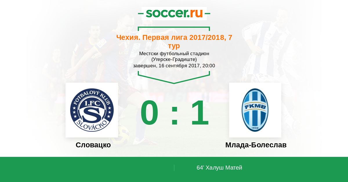 Чехия. Первая Лига 17.09.2016 Млада-Болеслав Логотип футбольный клуб Млада-Болеслав 3:0 Логотип футбольный клуб Словацко (Угерске-Градиште) Словацко