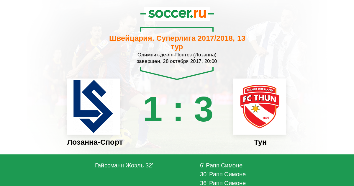 Швейцария. Суперлига 19.08.2017 Тун Логотип футбольный клуб Тун 5:2 Логотип футбольный клуб Лозанна-Спорт Лозанна-Спорт