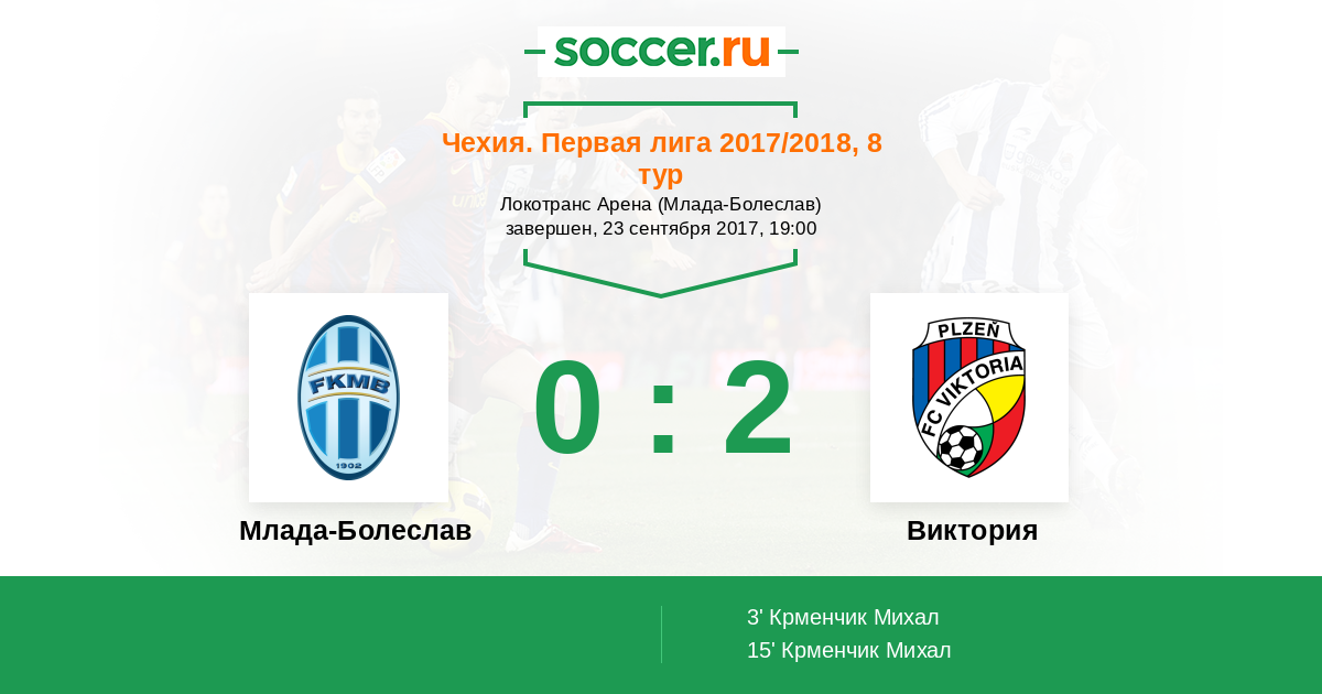 Чехия. Вторая лига 02.11.2002 Виктория Логотип футбольный клуб Виктория (Пльзень) 2:0 Логотип футбольный клуб Млада-Болеслав Млада-Болеслав